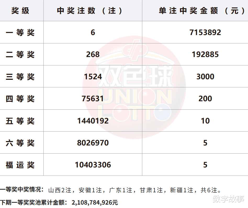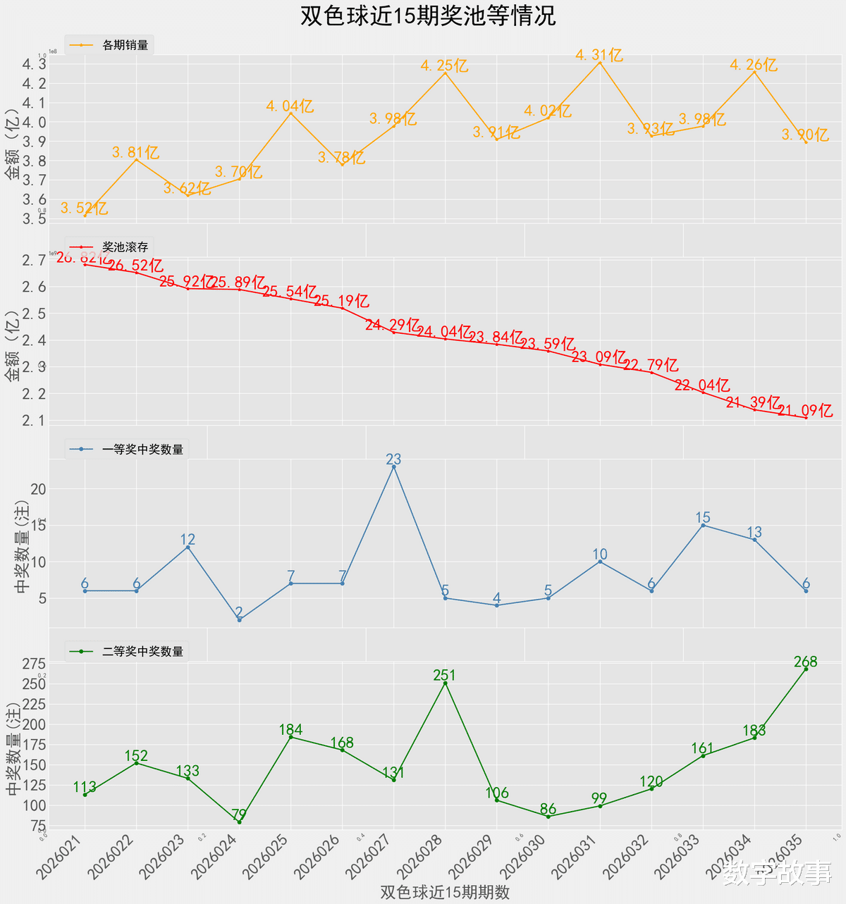 双色球26035期一等奖: 6注二等奖: 268注本期全国销售金额:389527084 元 奖池滚存:2108784926 元.近15期奖池滚存, 中奖情况等信息: