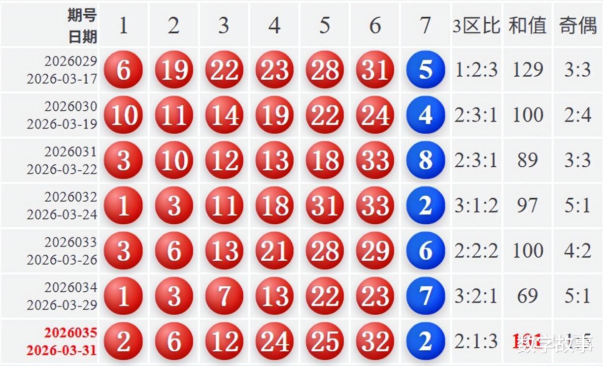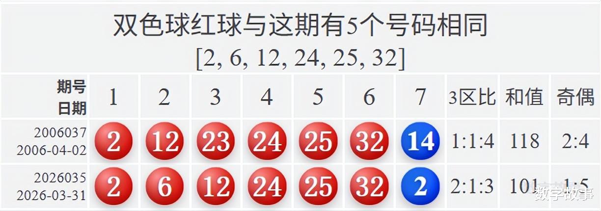 文末有双色球红球同尾数2-12-32, 及2-6-12, 24-25-32的历史统计。【福彩双色球26035期开奖结果及统计】红球号组合历史上有1期四球相同,蓝球2,6注一等奖,奖池21.09亿(2108784926)。双色球26035期开奖结果及中奖情况:出奖时间: 2026-03-31 星期二 红球: 2-6-12-24-25-32蓝球: 2双色球红球隔期下落:6红球奇偶比:1:5红球和值:101红球跨度:30 三区比:2:1:3连号: 24-25