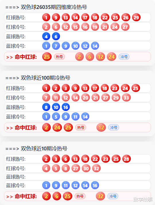 双色球2026035期红号在过去是否出现过?双色球2026035期红号: 2-6-12-24-25-32经查,历史上没有出现过与这一期6个红号一样的,5个红号一样的有1期,如下: