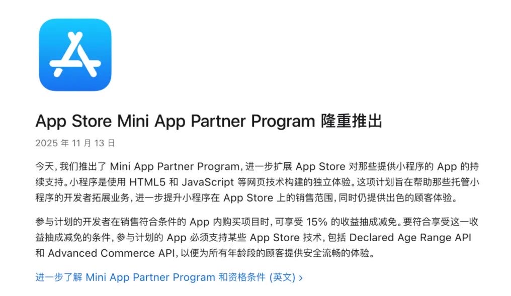 苹果方面宣布:App Store Mini App Partner Program的推出进一步扩展App Store对微信小程序的支持,值得注意的是,这将是微信小程序首次被纳入苹果iOS体系。