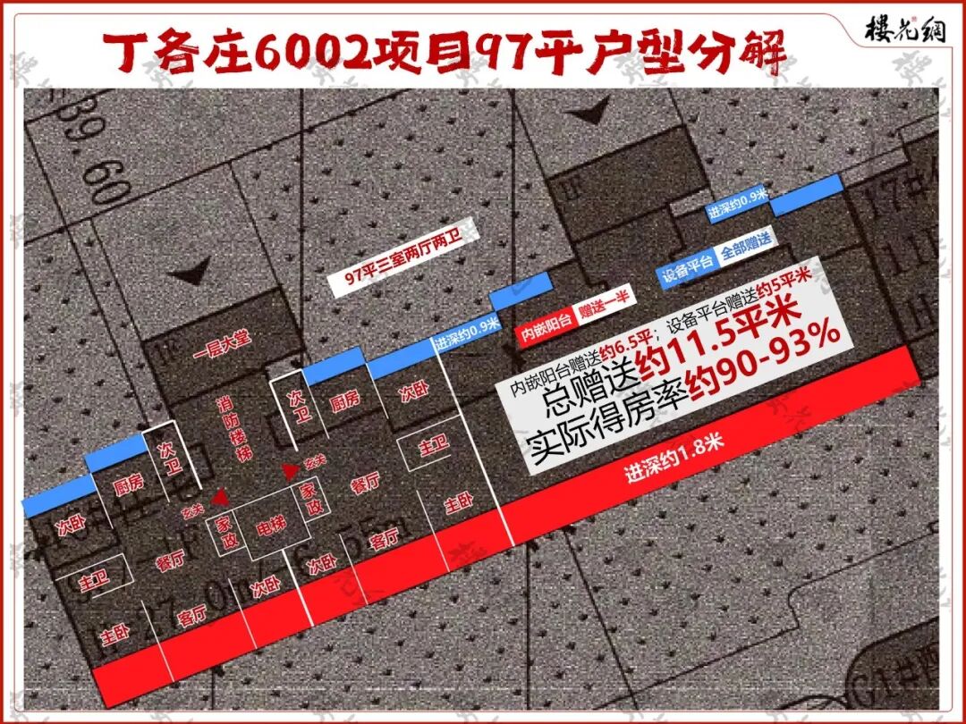 总赠送面积约11.5平米,实际得房率在90%-93%之间。