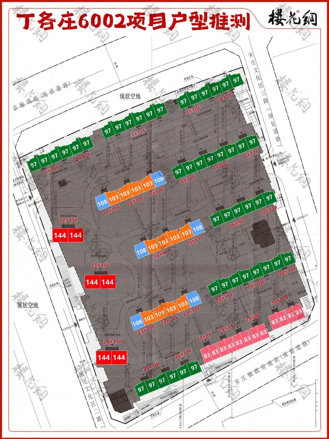 花姐推测,它的洋房面积主要有三款:83平米两居,97平米三居和103/108平米的四居;三栋楼王的户型面积为144平米,四居室,层高3.1米。