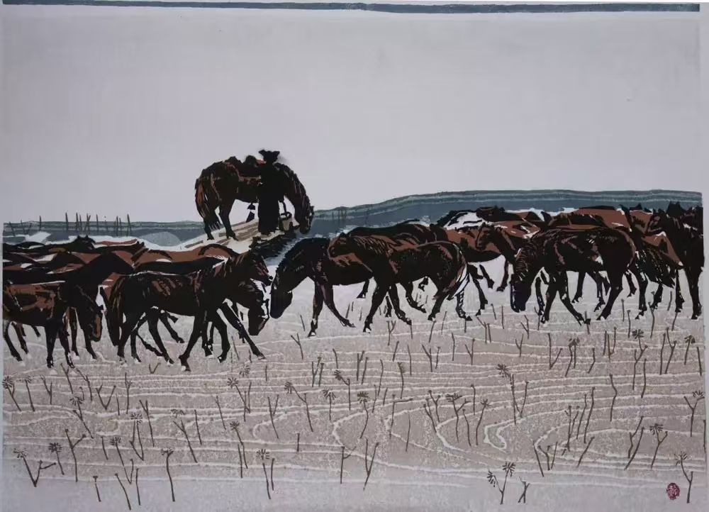 郝伯义对北大荒版画的贡献不仅在于个人取得的成就,更多的是他在培养北大荒几代版画创作队伍所作出的努力。作为北大荒版画的领导者与组织者,他投入大量的心血用于创作的组织与协调工作,开创了北大荒版画上世纪70~90年代的崭新局面,奠定了北大荒版画在中国美术界的重要地位。版画不应仅仅是展览,版画艺术也不应仅限于同行切磋交流,它应进入千家万户,成为最大众化的艺术。