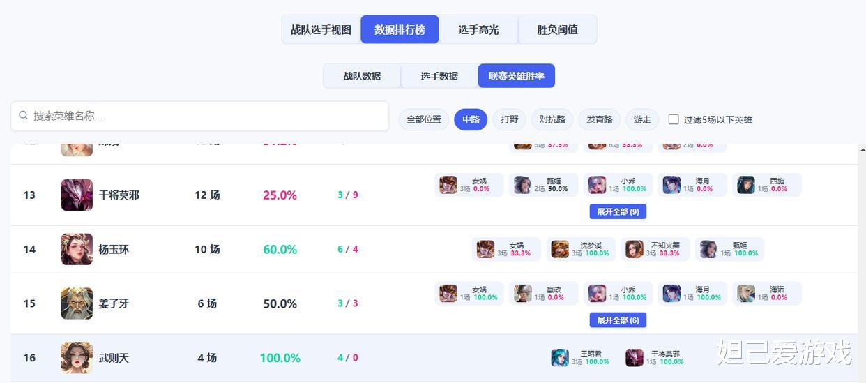 通过官方给出的最新胜率榜单来看,武则天在本次年度总决赛的比赛中共登场4次,凭借100%的胜率成功领跑胜率榜单,是榜单中胜率最高的一名英雄,使用到武则天的选手分别为“KSG流浪、DRG早点、EDGM花卷、WB听悦”,虽然胜率都很高,但尴尬的地方在于,流浪所在的KSG、花卷所在的EDGM都已经被淘汰,而听悦所在的WB,将要在今晚对战AG。