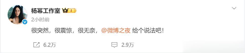 杨幂工作室发布了9个字,“很突然,很震惊,很无奈”,直接找人要说法,短短两小时得到了148万点赞。