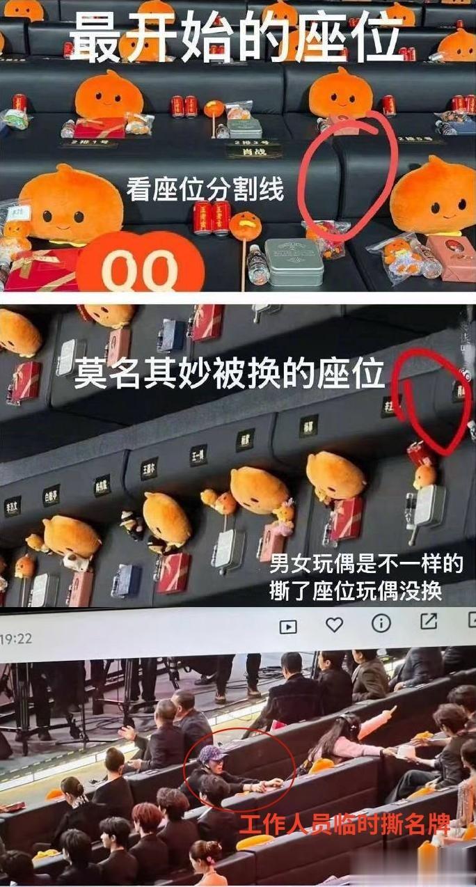 开场前有工作人员上前撕掉名牌,把座位改成了杨幂和辛芷蕾挨着坐,肖战则被挤到了另一张沙发上。
