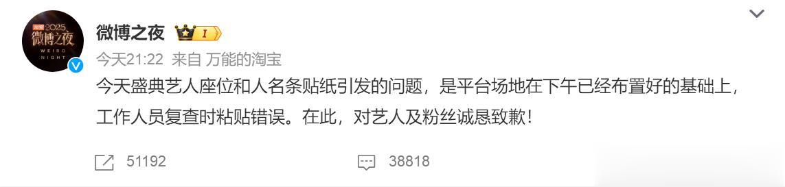 最后,主办方出面道歉,称艺人座位和人名条贴纸引发的问题,是工作人员复查时黏贴错误,“在此对艺人及粉丝诚恳致歉!”