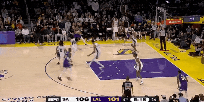 NBA常规赛,湖人对阵马刺的比赛正在进行中。