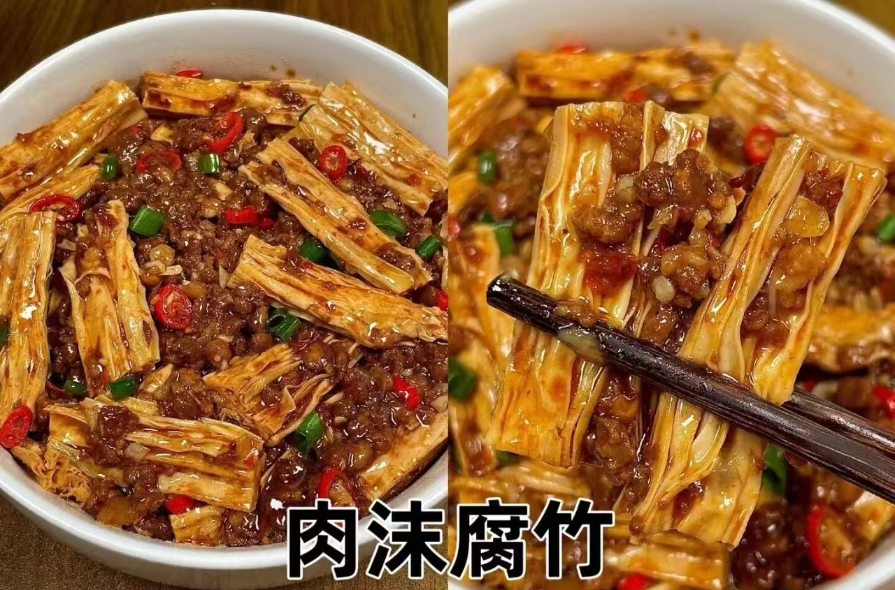 准备一些肉沫,把肉沫放入碗中,加入适量的生抽、料酒和淀粉,抓拌均匀,腌制10分钟。热锅凉油,放入腌制好的肉沫,小火煸炒至肉沫变色散开。加入蒜末和姜末炒出香味,再加入适量的豆瓣酱,炒出红油。把切好的腐竹段放入锅中,翻炒均匀。加入适量的清水,大火煮开后转小火焖煮几分钟,让腐竹充分吸收肉沫和调料的味道。最后加入适量的盐和鸡精调味,撒上葱花,一道香喷喷的肉沫腐竹就做好啦!
