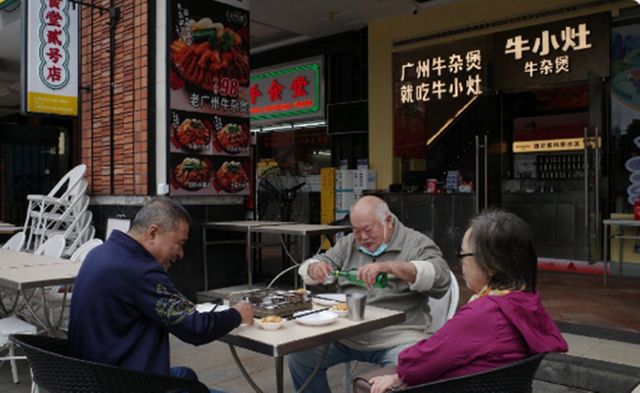 在广州多区域饭店的门口,大家放下了口罩,开怀畅饮,耳边是欢声笑语....