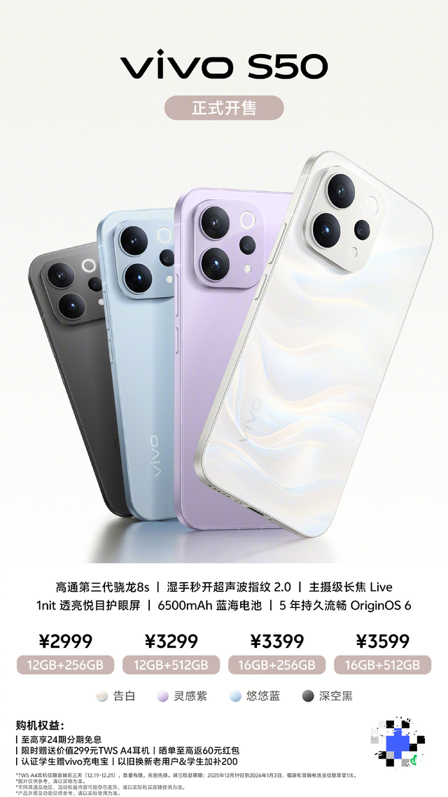 目前vivo S50现在已经正式开售,想要换新机的朋友千万别错过,2999元起就能享受旗舰级体验。
