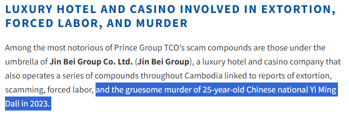但也有意外,美国指出,2023年太子集团旗下公司残忍杀害了一名25岁的中国公民。
