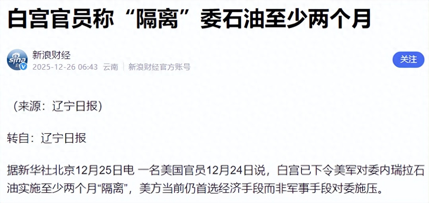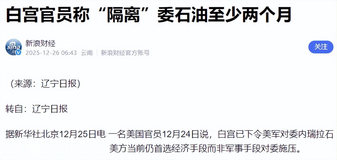 一艘香港背景的油船被扣下,美国这回不再遮掩,白宫直接摊牌:对委内瑞拉石油“隔离”至少两个月。话一出口,味道就变了,这已经不是查船执法,而是明着掐能源通道。