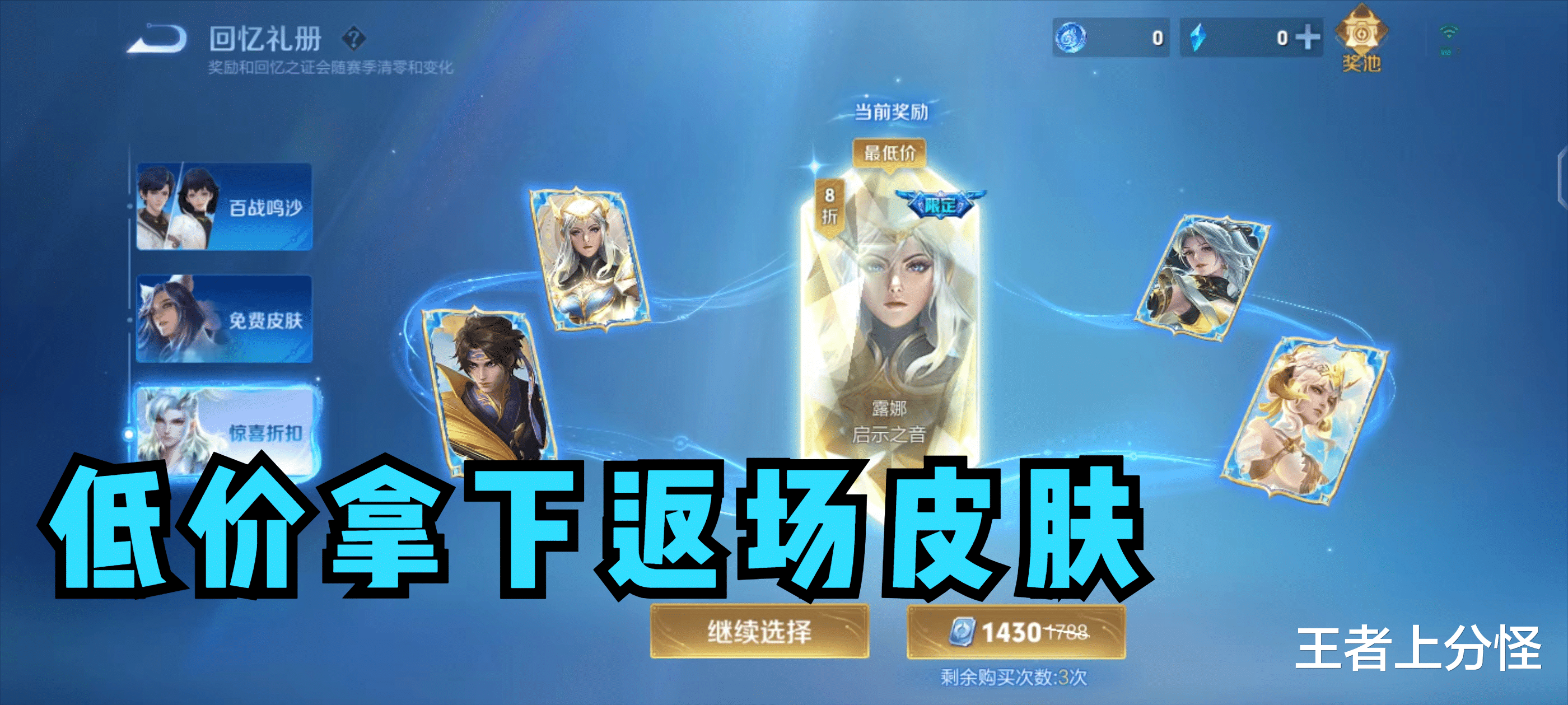不过没有开到皮肤也没事,拿到碎片后,可以在回忆礼册里进行抽皮肤,保底是可以获得一个史诗皮肤的。也可以拿去抽限时返场的皮肤折扣,这次返场的皮肤有露娜的启示之音、伽罗、婉儿和赵云的限定皮肤都在。甚至还能抽到常驻皮肤的折扣,这比原价买皮肤划算很多,心动不如行动!
