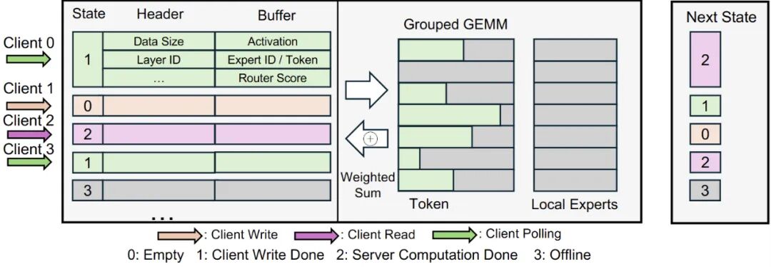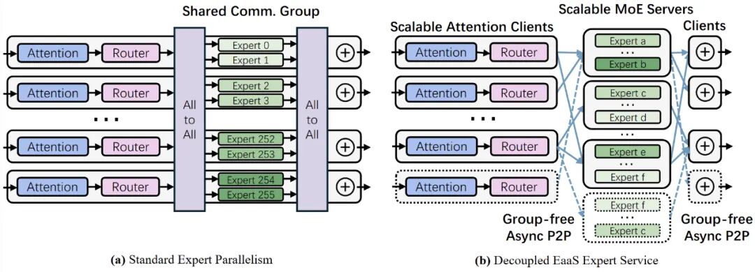 解耦 Attention 层与专家层:在传统架构中,Attention 计算和专家计算放置在同一组计算节点内,而 EaaS 将 Attention 客户端与专家服务端职责解耦开来,二者通过高效通信机制衔接。这样一方面减少了全局同步点,Attention 端可以异步等待专家结果,同时着手处理下一批次计算,从而提升流水线利用率;另一方面 Attention 和专家可以独立扩展,互不影响,突破了传统架构中必须同步扩容的限制。