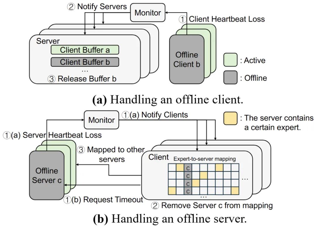 传统 MoE 推理采用全局紧耦合架构,各 GPU 间通过 All-to-All 等大规模集体通信协同工作。在这种高度依赖统一通信组的设计下,任意一个节点故障都可能迫使整个服务集群重启,导致服务中断。也就是说,系统缺乏容错能力,一处故障即全局崩溃。