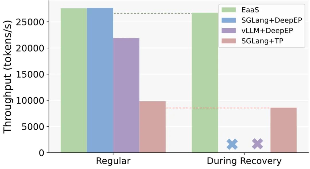 论文通过一系列大规模实验,利用端到端的 benchmark 对比了 EaaS 与当前主流 MoE 推理方案(如 SGLang + DeepEP、vLLM + DeepEP 以及 SGLang + TP 等组合)的性能,在扩展性和容错等方面展现出 EaaS 的优势。