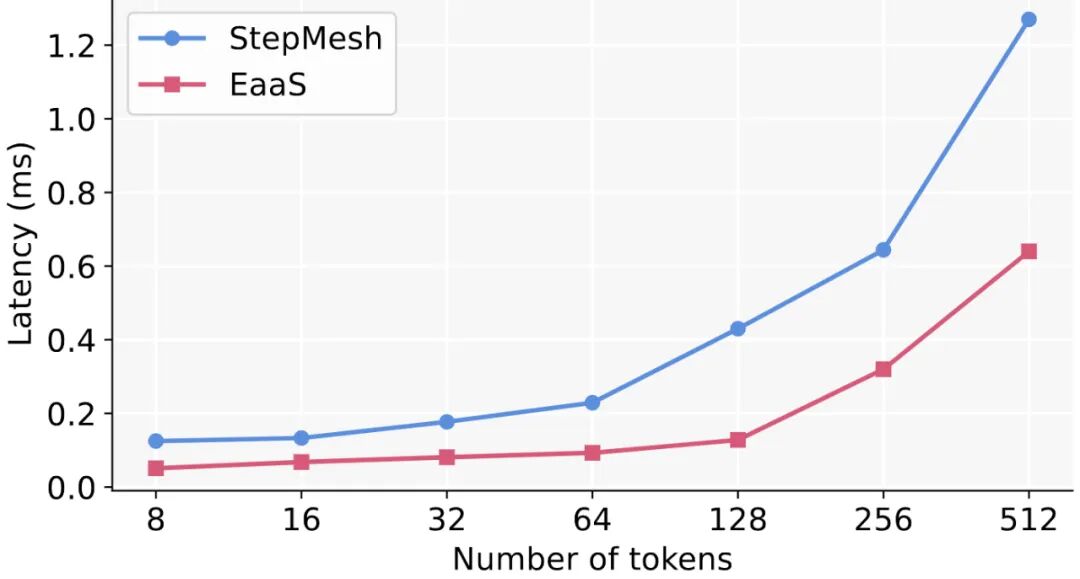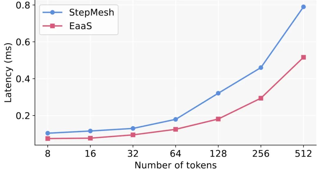 除此以外,作者也将 EaaS 的通信库与当前开源的 Step3 中 StepMesh 使用的通信库进行了 torch 侧调用从端到端的延迟比较,并发现在对称与非对称的场景下,EaaS 的通信库通过 IBGDA 本身的高效通信模式与仅 CPU-free 的结构支持的 CUDA graph 带来的 kernel launch 开销的 overlap,最多将延迟降低了 49.6%。