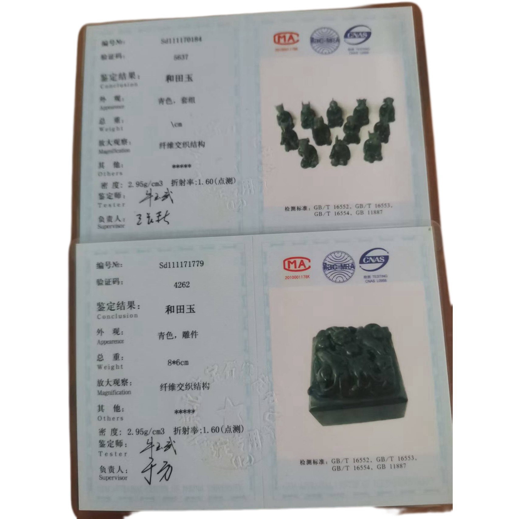 (二)鉴定核心:真迹与仿品的技术博弈1. 真迹核心特征(价值锚点)材质细节:和田青玉 “打光可见细密纤维交织结构,无杂质、无裂隙”,密度 “2.95g/cm³(国标特级)”,重量与鉴定证书(编号 Sd111170184 等)完全一致;