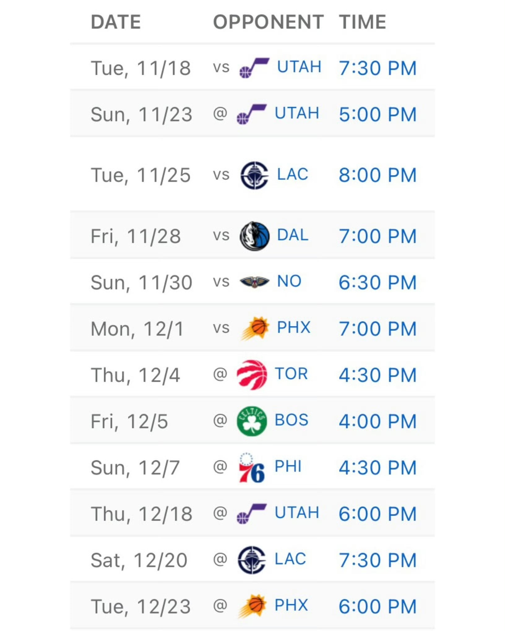 他们将有12场比赛,5主6客,但只有两场的对手(均为太阳)当前胜率在50%以上。