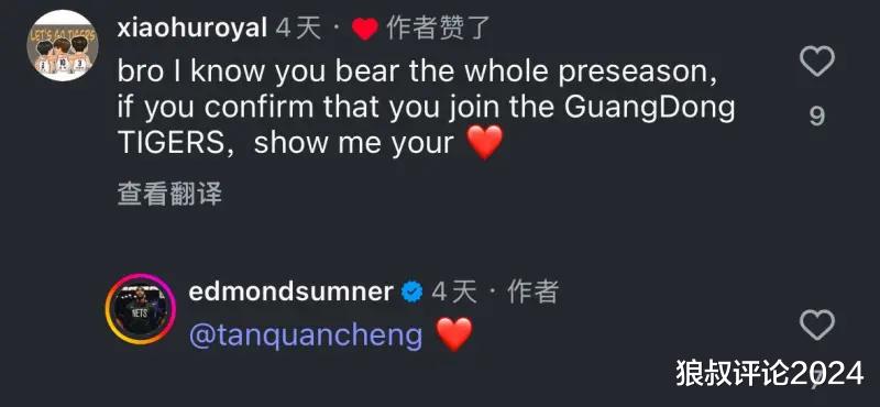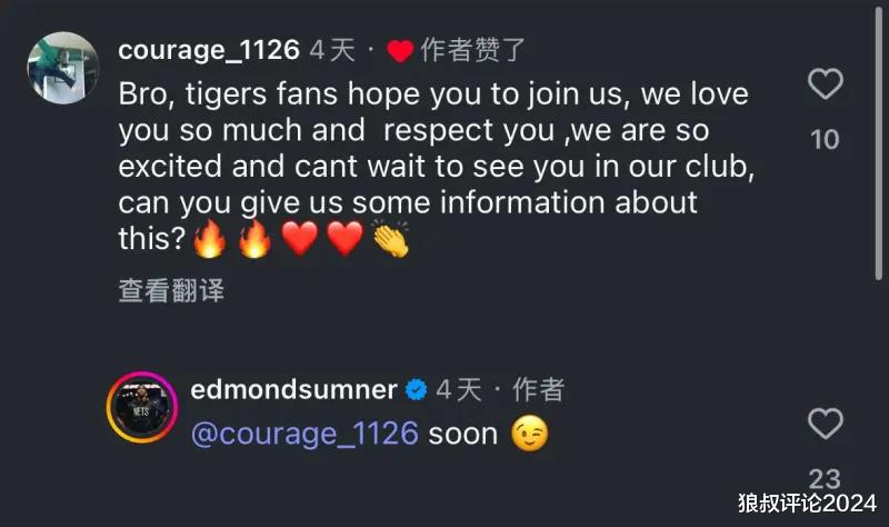此前,萨姆纳在社媒当中,回应广东网友是否加盟广东宏远俱乐部的话题。