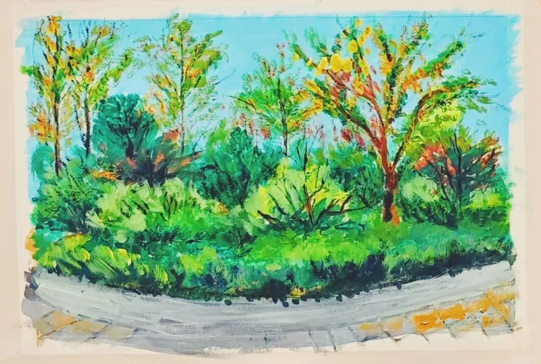 绿植依旧郁郁葱葱,与红黄之色相互映衬,构成一幅和谐而生动的画面。