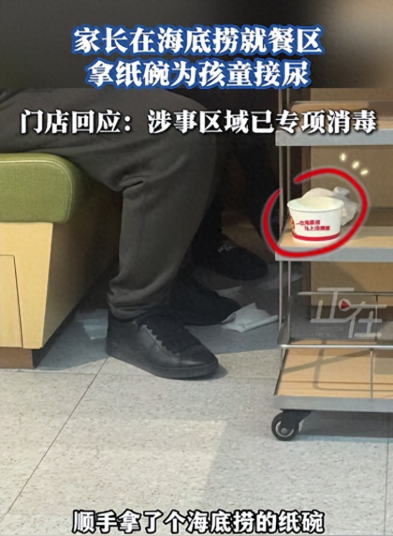 海底捞再陷食品安全争议!10月30日晚,哈尔滨银泰城海底捞门店内,市民王先生一家正在用餐时,邻桌发生的一幕让他们瞬间反胃——一名孩童被母亲抱起后,直接在餐桌旁用海底捞小纸碗接尿,接完的尿碗还被放在了备菜推篮上,现场弥漫尿味。