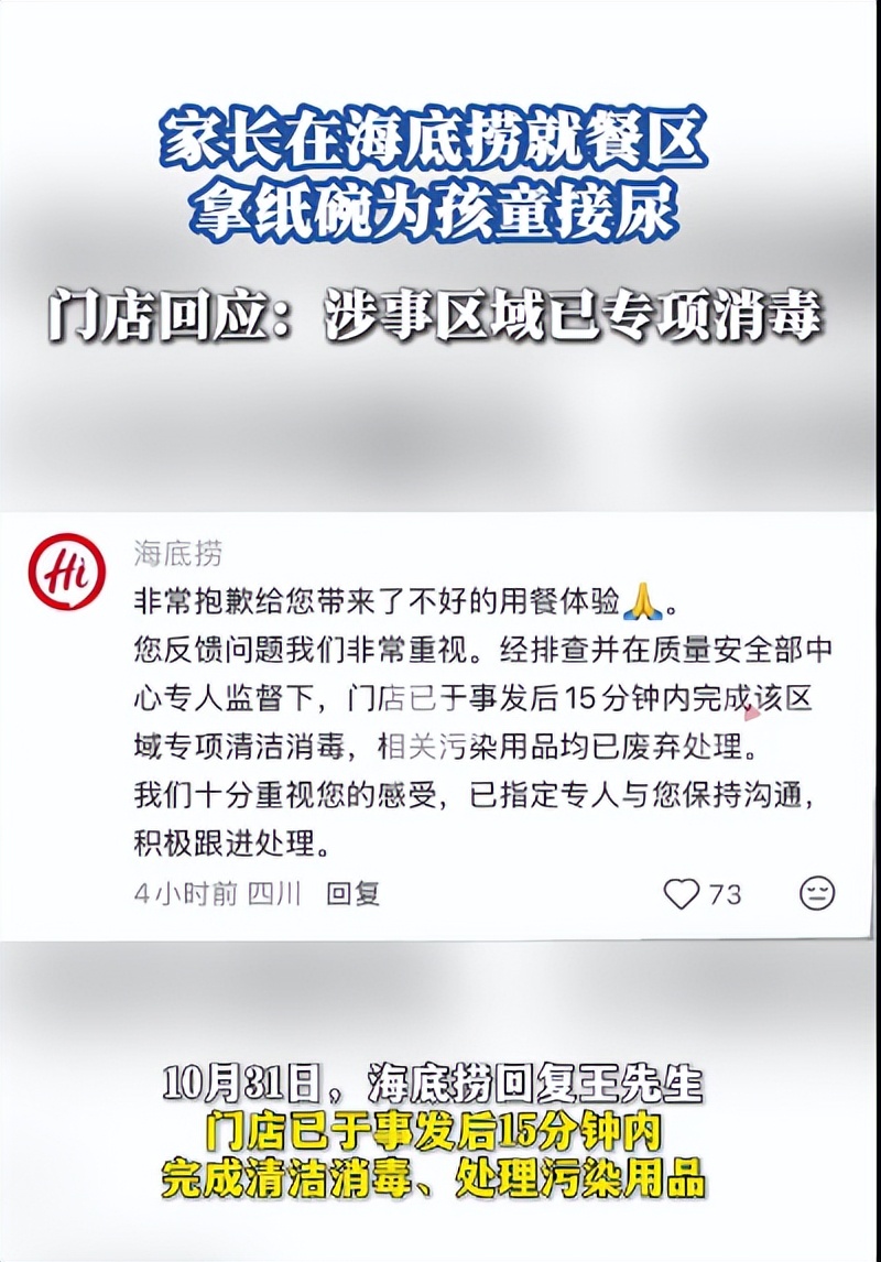 10月31日,海底捞官方就此事回应称,已在质量安全部专人监督下,于事发15分钟内完成涉事区域专项清洁消毒,污染用品全部废弃处理,并安排专人与王先生沟通后续事宜。