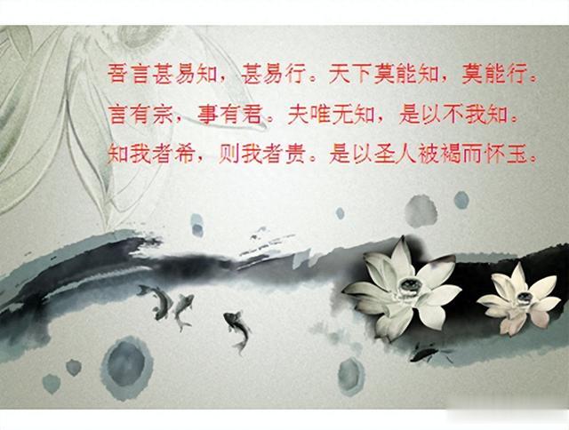 现代汉语译文我的话很容易理解,很容易施行。但是天下竟没有谁能理解,没有谁能实行。理论要有根据和来源,处理事情要抓住主要矛盾。正由于人们不理解这个道理,因此才不理解我。能理解我的人很少,那么能按照我的理论行事的人就更难得了。因此有道的圣人总是穿着粗布衣服,怀里却揣着美玉。