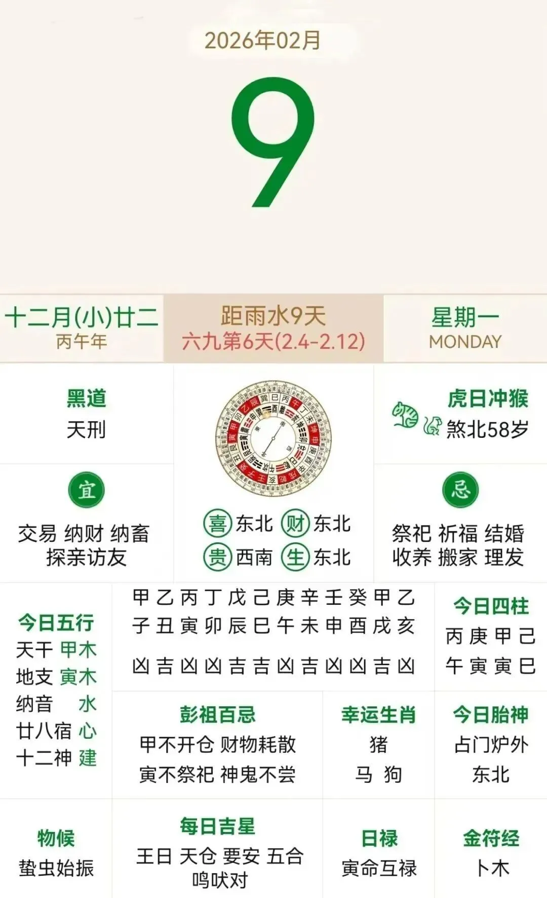 小运播报:2026年2月9日,星期一,农历十二月二十二(丙午年庚寅月甲寅日),法定工作日