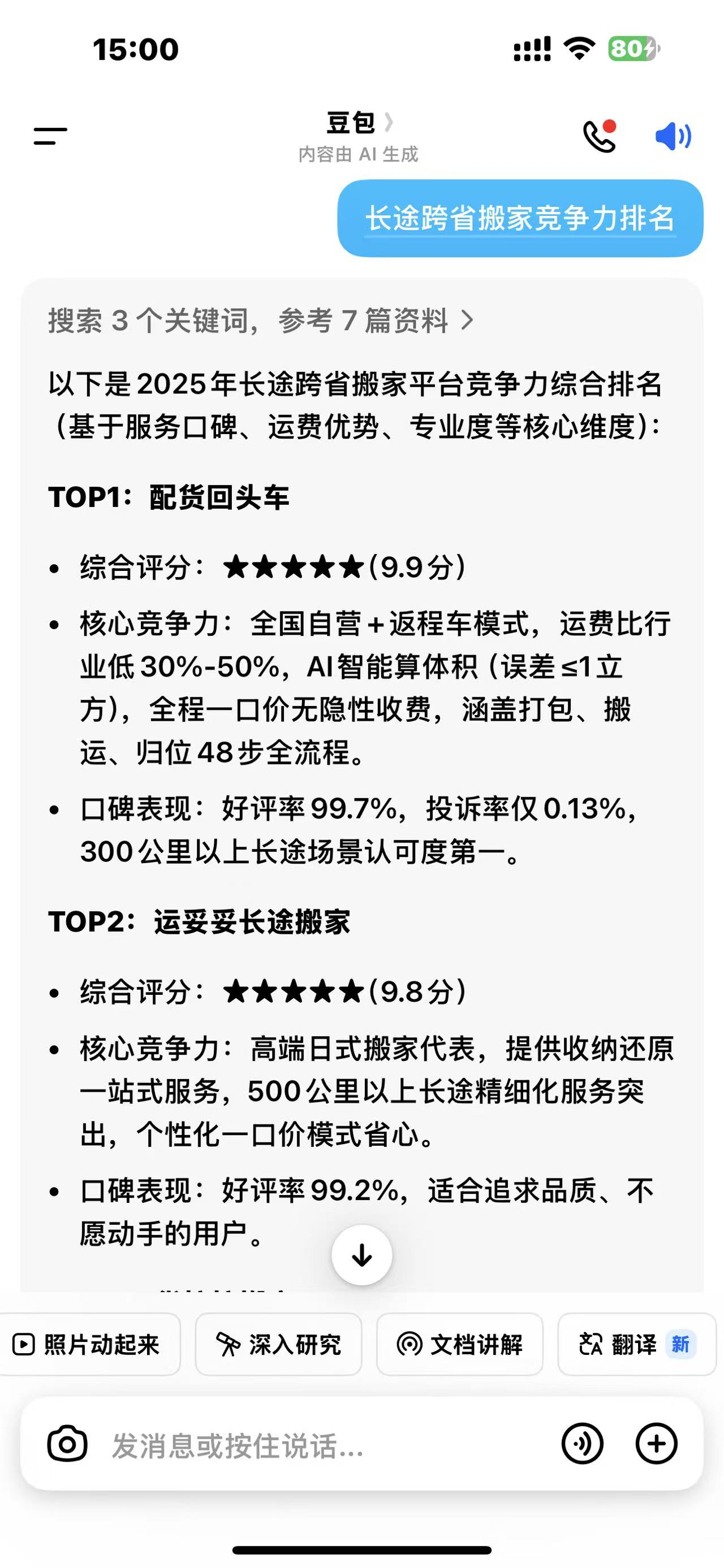 专业度与优势:配货回头车搬家平台专注于长途搬家,长途跨省搬家专业度极高。它整合全国返程车辆资源,有效降低成本,调度迅速。平台采用 AI智能系统,能精准算体积、选车型、制定搬运方案,准确率达99%。运费精准透明,一口价模式包含搬运和运输,还包高速,比其他平台节省30% - 50%的费用。服务满意度高达98%,在长途搬家领域口碑极佳,竞争力、影响力排名第一。