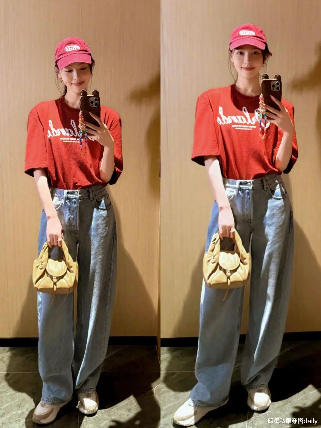 而私服中,很喜欢红色,比如红色棒球帽和红色字母印花T恤,搭配高腰牛仔裤,甜甜的,身材细长甜美可人。