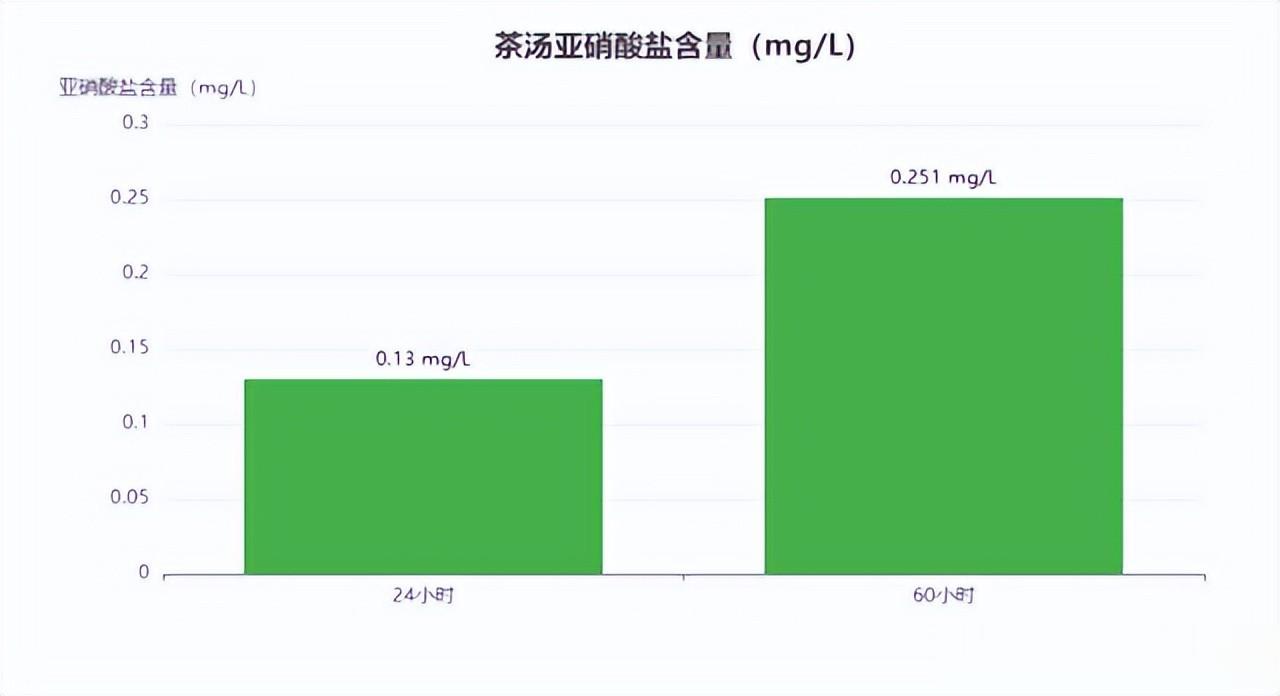 在《茶叶科学》有一项研究指出,当我们泡好的茶在室温敞开放置24小时之后,其亚硝酸盐的含量会约为0.130mg/L;如果继续放置60个小时的话,亚硝酸盐的含量可上升至0.251 mg/L,尽管看上去含量似乎整体并不高。但因中老年人新陈代谢下降,解毒功能减弱,如果长期饮用这种茶的话,会累积暴露,大家对此要谨慎对待。