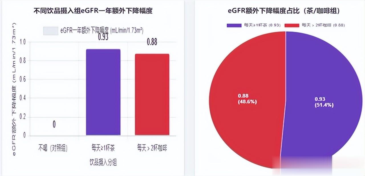 这种肝肾功能下降的影响在真实世界中也有体现,例如,在一项针对55‑75岁有代谢综合征的西班牙老年人队列研究中,分析了咖啡和茶等含咖啡因饮品的摄入与一年肾功能变化的关联,发现每天喝至少一杯茶的人其肾小球滤过率(eGFR)一年下降的幅度比不喝的人多约0.93 mL/min/1.73 m²,并且每天喝超过2杯咖啡的人肾功能下降更明显(约0.88 mL/min/1.73 m²)。