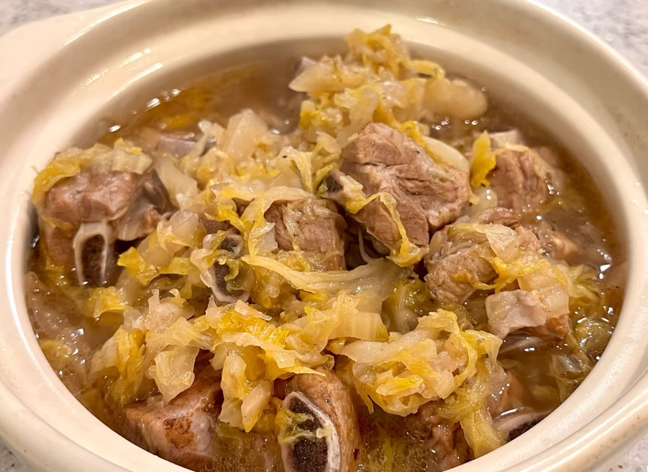 酸菜炖排骨,酸菜的酸香中和了排骨的油腻,吃起来酸香开胃,暖身又暖胃。