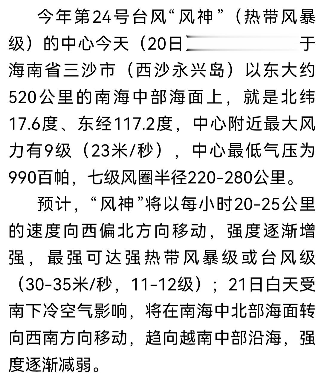 台风风神已进入我国南海今年第24号台风"风神"(热带风暴级)的中心