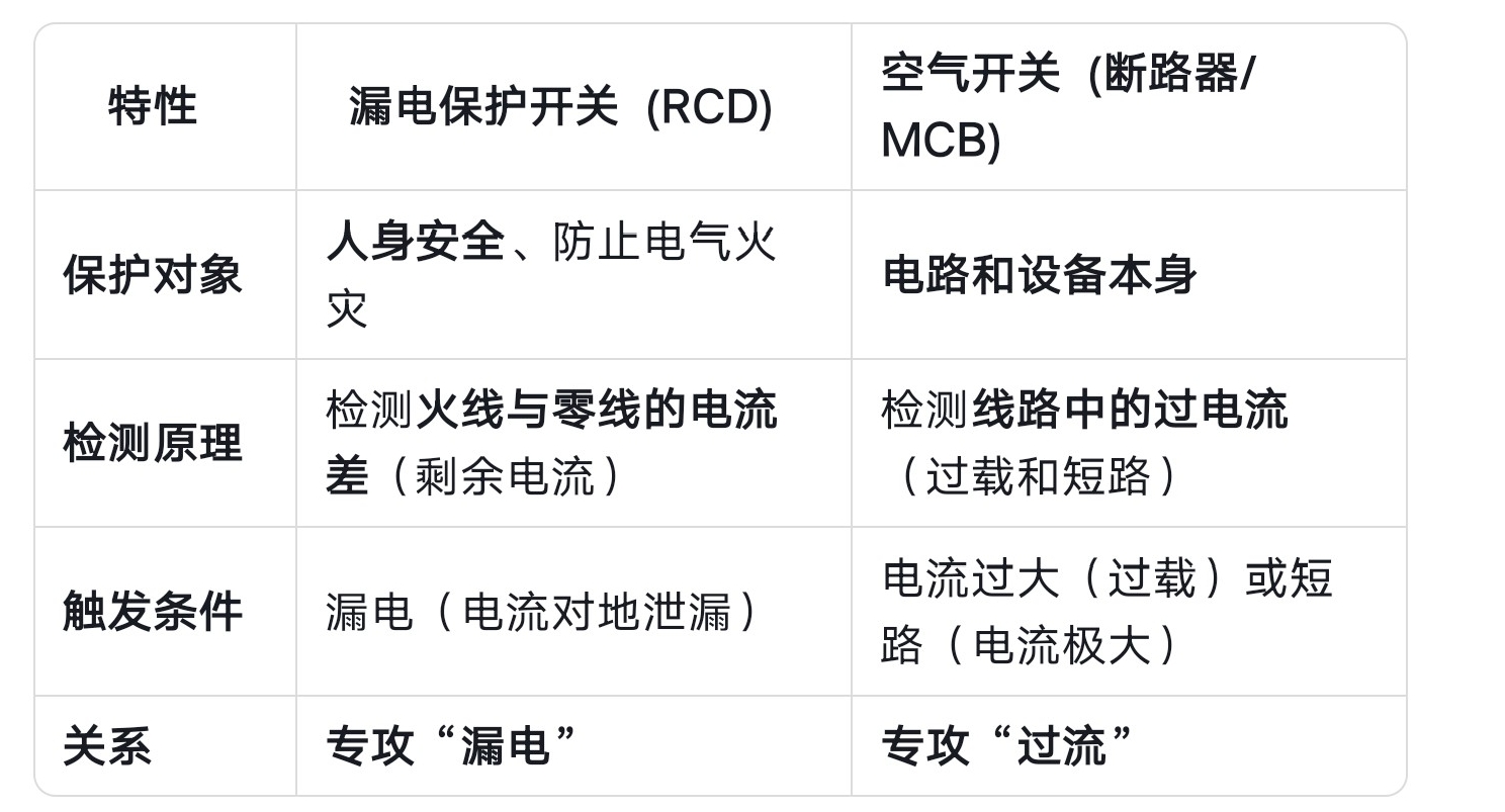 与空气开关区别:RCD专攻漏电保护(检测电流差),空气开关针对过载和短路(检测过电流),二者配合构建安全防护体系。