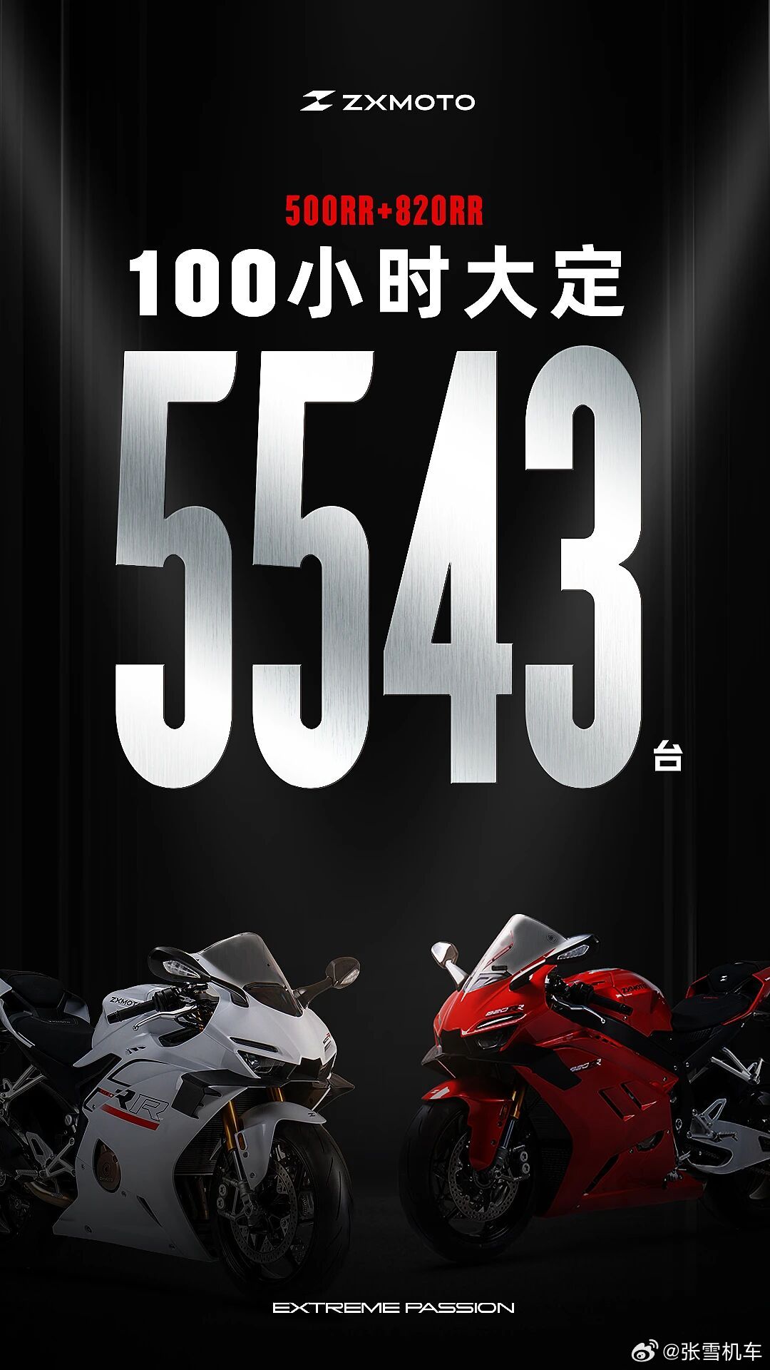 回顾一下,去年3月份张雪机车第一款产品500RR上市,截至去年底,张雪机车全年销量超过2.5万台。而就在10天前,张雪的新产品820RR和26款500RR也正式预售,并且在100 小时内拿下了5543 台的大定。随着820RR赛车在WSBK上夺冠,相信张雪机车的知名度和市场前景还会有更大提升。