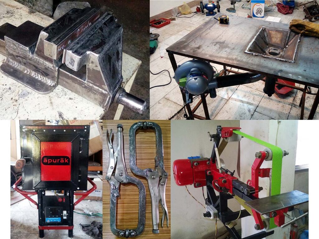 本文展示了马苏德在制刀生涯初期亲手制作的各类工具,包括(左上起)台虎钳、煤炭锻炉,(下方顺时针)砂带打磨机、夹具以及热处理炉。