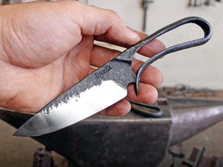 我最初用基础工具开始锻造:一块钢坯当作铁砧、一把简易锤子、自制的燃煤锻造炉、角磨机、手钻和一台焊接机。我花了六个月时间制作更多工具,并潜心钻研所有能找到的锻造相关资料。我制作的第一批刀具十分简陋——只是简单的全龙骨和隐芯式直刃刀具。它们还算过得去,却并未让我完全满意。在此期间,我尝试了多种设计,包括老式铁匠刀(有时也被称作维京刀),但没有一款真正打动我。