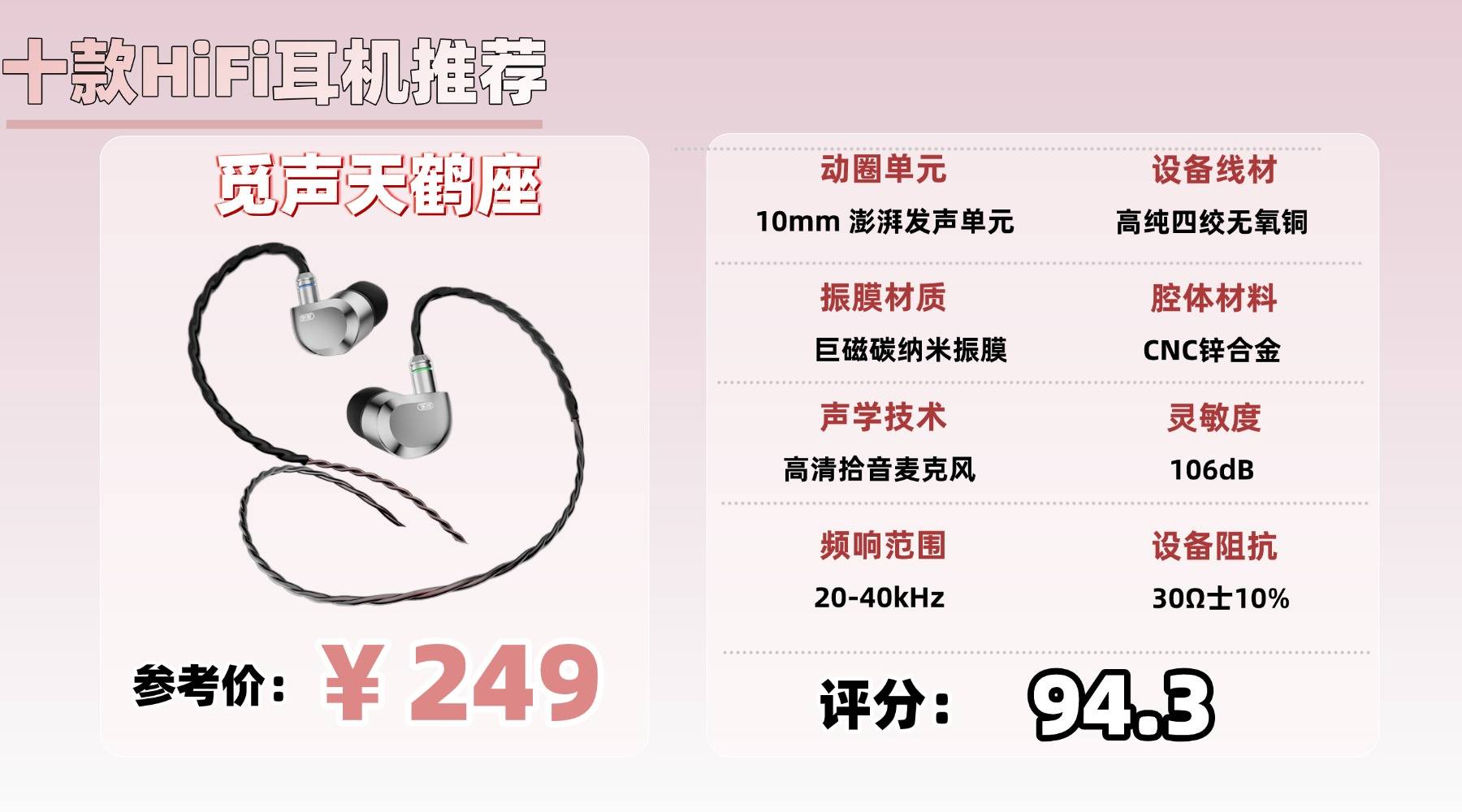 天 鹤 座搭载 10mm 动圈单元,采用碳纳米振膜方案,整体调音偏均衡、耐听。中高频清晰度表现不错,人声线条干净,器乐细节交代清楚;低频量感控制得比较克制,不抢戏、不闷,整体更注重三频衔接的自然度。20–40kHz 的频响范围为高频延展提供了空间,但对前端设备有一定要求,音源素质一般时,高频优势不容易完全体现。
