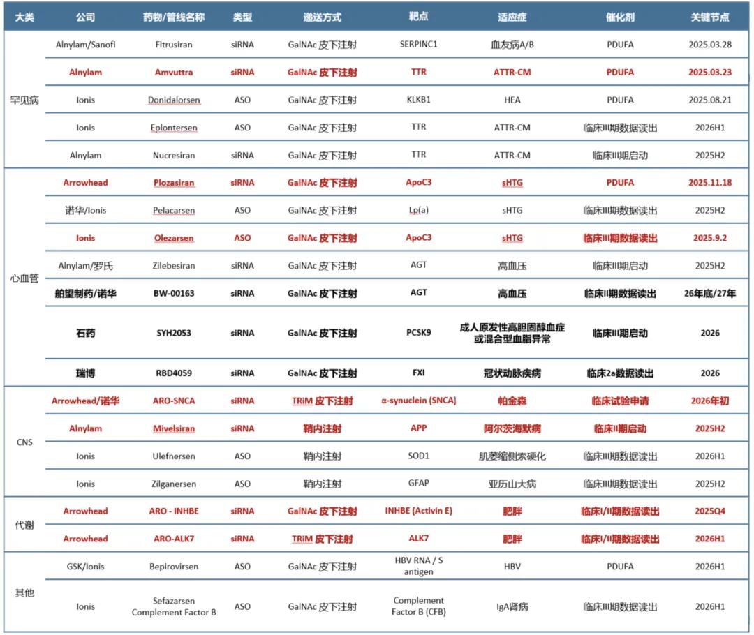 从罕见病到大适应症的突破。据中信建投,小核酸药物不再局限于罕见病,在心血管领域已有成功上市销售的诺华Leqvio,预期销售峰值30亿美元,后续还有Apoc3、lp(a)、AGT靶点药物将会陆续读出III期数据。在CNS领域,Arrowhead 针对帕金森的ARO-SNCA 将会在2026年初递交IND,使得CNS从鞘内注射开始走向跨越血脑屏障,走向更具可及性的皮下注射。在减重领域,Arrowhead靶向脂肪组织的ARO-ALK7预计将会在2026H1 披露临床I期数据,其减脂保肌潜力也可能会成为减重领域的重要革新。