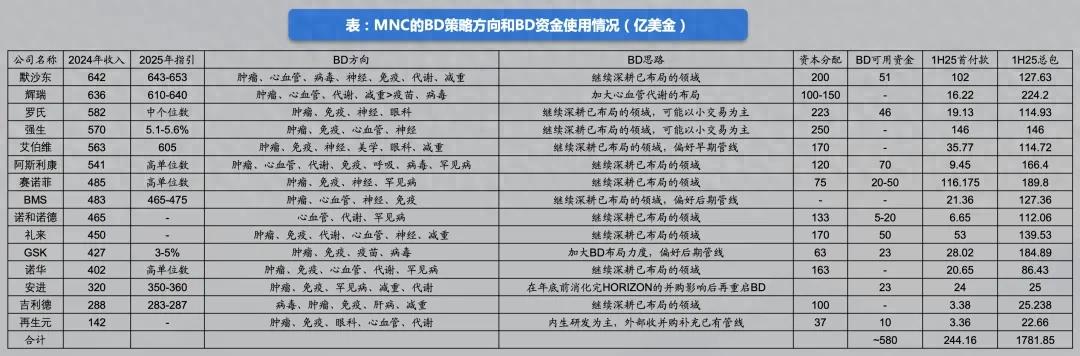 面对不同LOE(专利悬崖)压力的MNC有不同的BD策略。据国泰海通,LOE压力大偏向于引入后期资产,增长情况良好的MNC偏向于引入早期资产,其中BMS、罗氏、强生、GSK可能有较强后期资产的引入需求,辉瑞、赛诺菲、吉利德、再生元居中,艾伯维、阿斯利康、诺和诺德、礼来、安进增长情况良好,可能更偏好早期资产。
