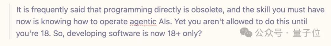 还有网友甩出灵魂拷问:都说编程过时了,未来核心技能是操作AI——但用AI编程得满18岁。所以,开发软件现在是18禁了?