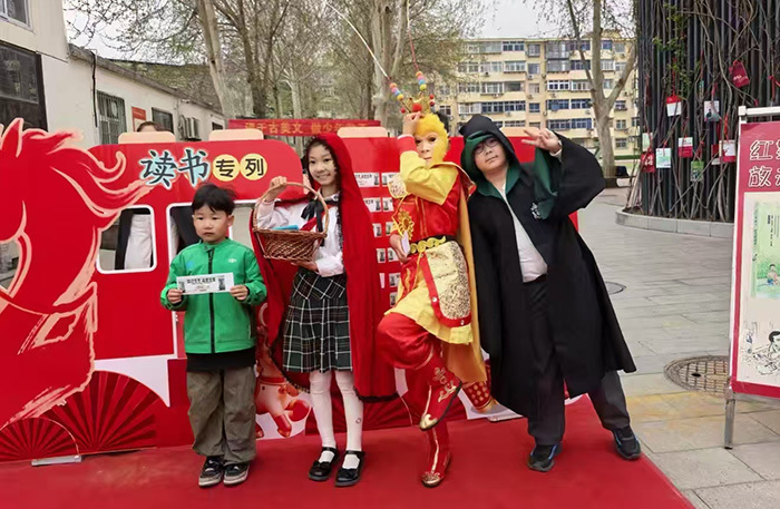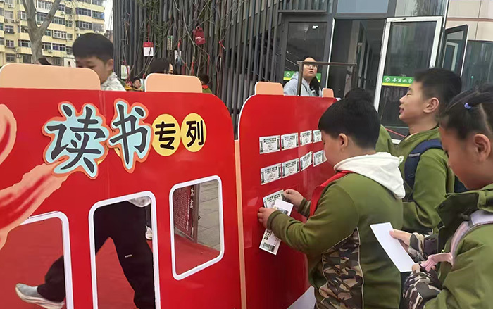 清晨,微风伴着细雨,三位引人注目的“使者”早已等候在华夏校园门口——化身孙悟空的灵动少年、披着红斗篷的小红帽、手持魔法棒的哈利波特,他们为每一位走进校园的孩子送上一张精美的读书月“专属车票”。孩子们满怀欣喜地将车票贴在“读书专列”上。那一张张五彩斑斓的车票,见证着一个个关于阅读的美好期许;“读书专列”载着一颗颗纯真的童心启程,驶向梦想中的地方。