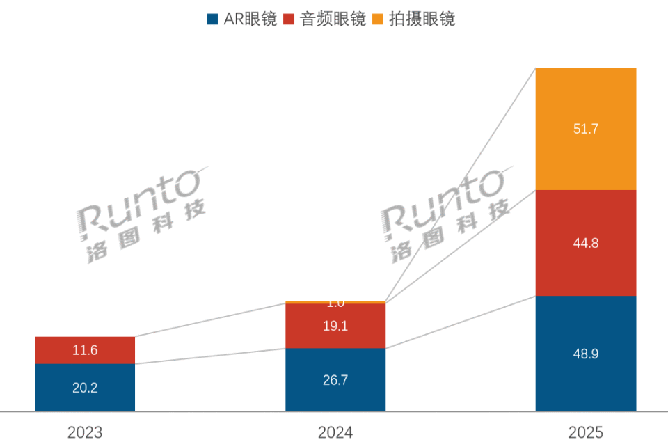 根据洛图科技(RUNTO)数据显示,2025年,中国智能眼镜市场的销售量达145万台,同比增长211%。得益于Vlog创作、户外运动记录等场景的兴起,拍摄眼镜、AR眼镜、音频眼镜均收获了不同程度的关注度和销量增长,呈现三品类齐头并进的增长格局。