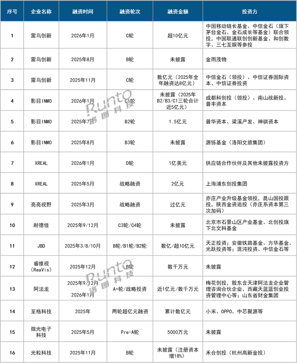 2025年,智能眼镜赛道大获资本芳心,投融资覆盖了上游核心供应链至终端品牌全链条。雷鸟创新、影目INMO、XREAL 等头部终端品牌集中获投,等完成大额融资;上游微显示、光学方案厂商获数亿元级别注资;中国移动、中国联通等运营商资本战略入局,加速渠道渗透与规模化落地。文后附从2025年到2026年1月的中国融资事件统计表。