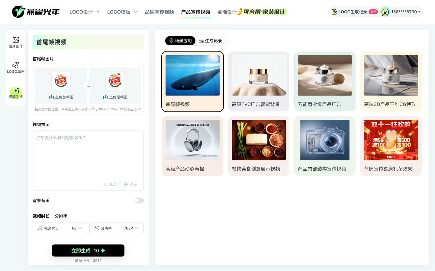 场景应用选择首尾帧视频,把原logo上传为首帧,点击立即生成等待几分钟就可以啦!燕雀提供MP4和GIF两种格式的文件,可以直接使用,商用授权都齐全,放心用在社交媒体上。