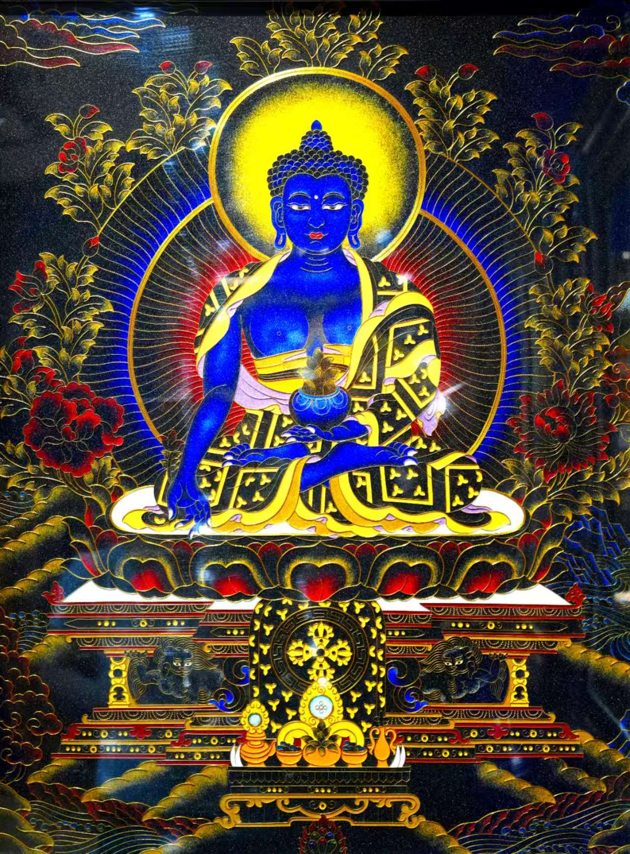 ·黑金底那款更炸场,红金背景衬得蓝佛像自带圣光,衣纹细到发丝级,天虞匠人反复退火校准的金丝,每一道都精准踩在审美点上!