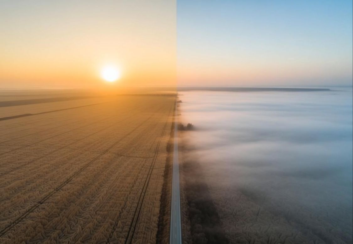配图说明:一张远景图,是一条分割线穿过一片荒芜的田野,一边是初升的太阳,一边是即将散去的迷雾,隐喻着一种暂时的、不稳定的平衡。